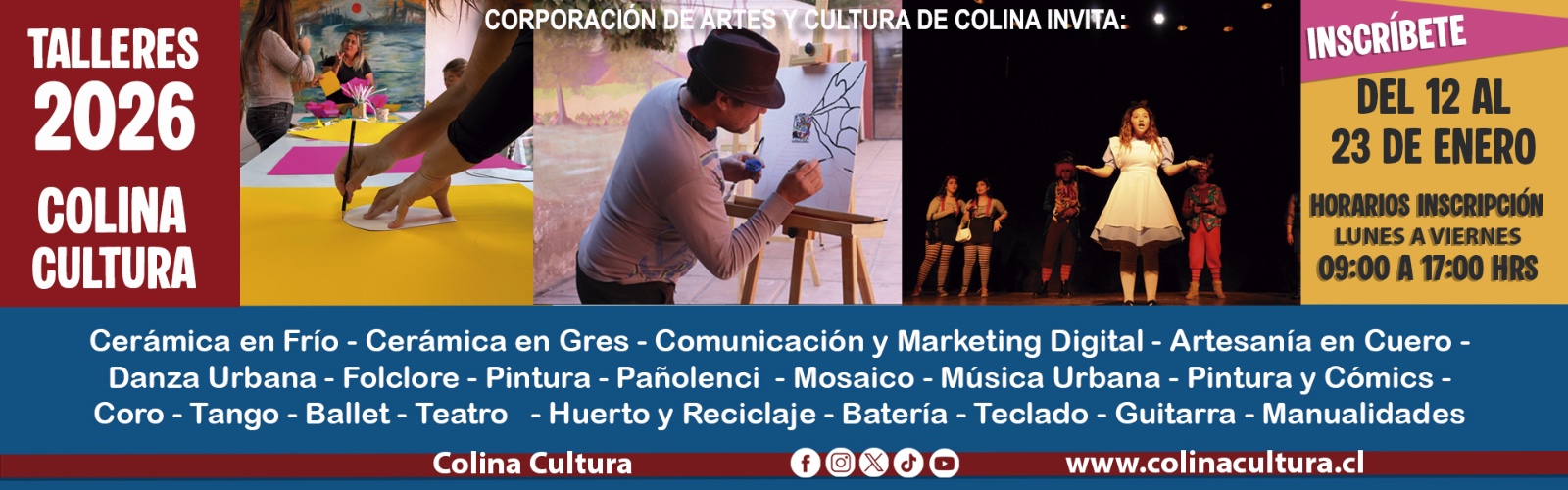 Centro Cultural de Colina, ubicado frente a la histórica Iglesia de la Inmaculada Concepción (1579), Monumento Nacional, fue inaugurado en 2011 tras su remodelación financiada por el Consejo Nacional de la Cultura y las Artes. Desde 2012 impulsa actividades y talleres artístico-culturales abiertos a la comunidad, garantizando acceso igualitario a bienes culturales de alta calidad. Además, promueve la asociatividad, el emprendimiento cultural y la difusión del patrimonio e identidad local, consolidándose como un polo estratégico de desarrollo artístico y social en la provincia. leer más