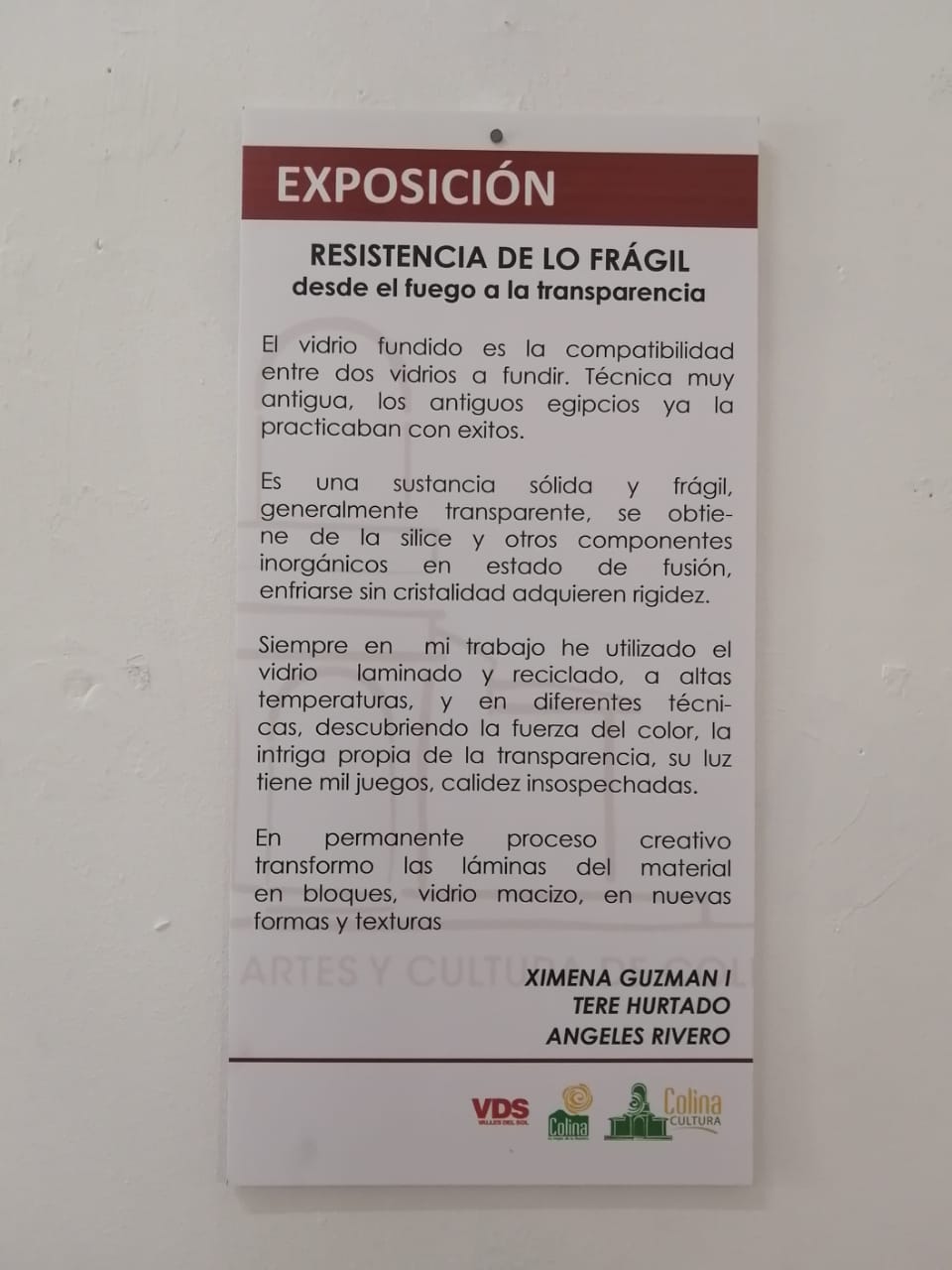 Este 12 de octubre fue inaugurada en el Centro Cultural de Colina la muestra «Resistencia de lo frágil, desde el fuego a la transparencia» de la artista Ximena Guzmán un trabajo de esculturas en vidrio de ventana que demuestra una manera diferente de trabajar este material, y en el que también participaron las artesanas Tere Hurtado y Ángeles Rivero.